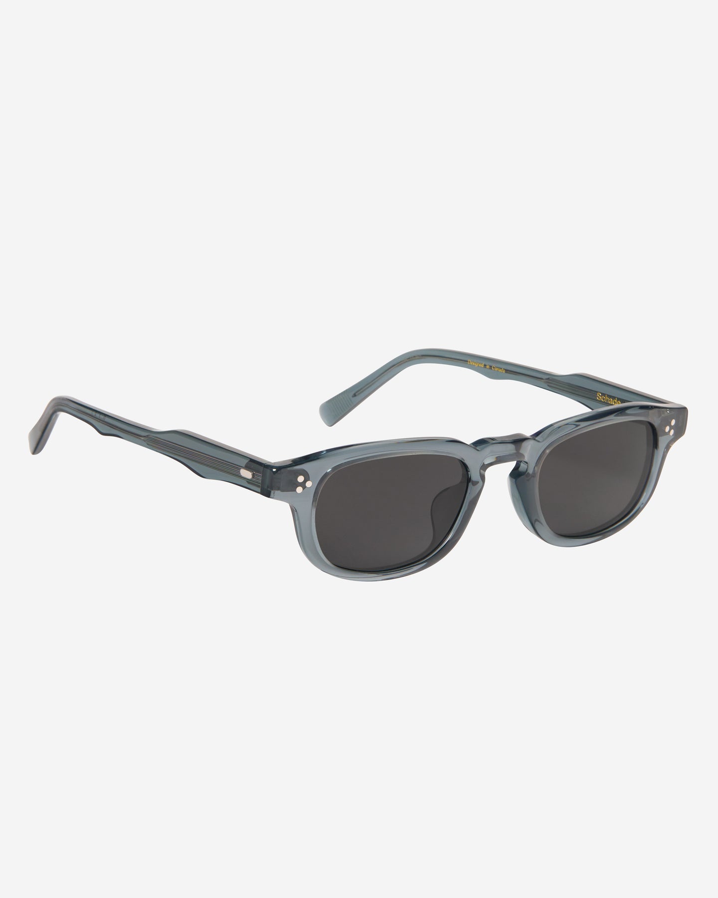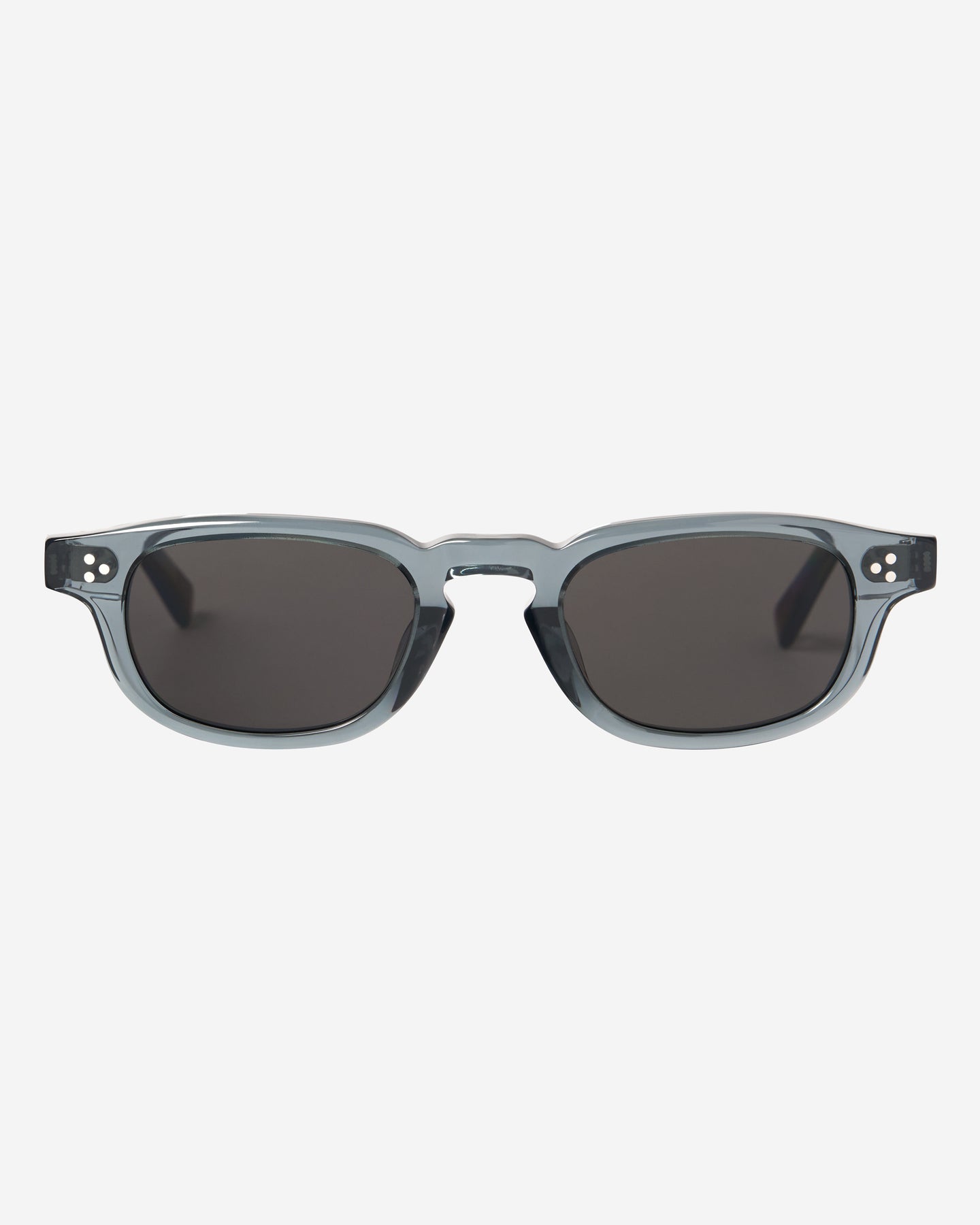 The design features a narrowed overall width, which exudes a confident but gentle edge, and is constructed with varying degrees of angular curves that add a deeper overall characteristic. A pyramid array of silver rivets are found on each side which securely attach the body to the arms, adding a distinct visual touch that is also exemplary of the highly detailed craft involved in designing and producing each frame. Finished with dyed lenses with anti-reflective and anti-scratch finishes, and 12mm high acetate nose pads for improved stability and grip.